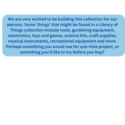 We are very excited to be building this collection for our patrons. Some 'things' that might be found in a Library of Things collection include tools, gardening equipment, electronics, toys and ga.png